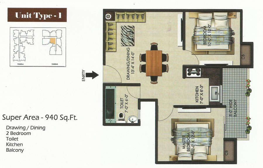| 2 BHK + 2 TOILETS + STUDY (Type-I) |