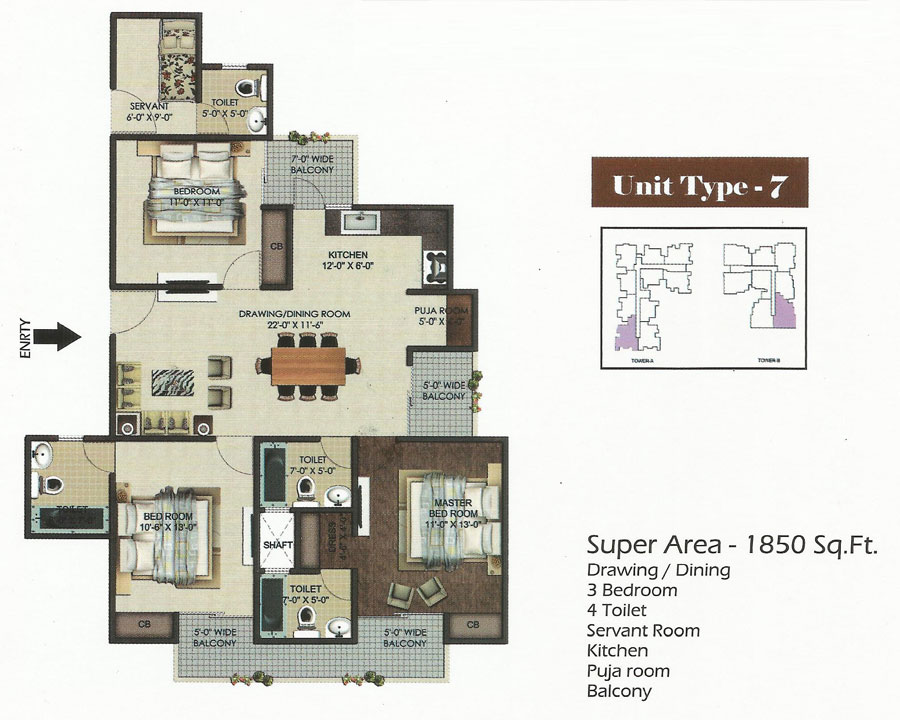 | 3 BHK + 4 TOILETS + SERVENT ROOM |